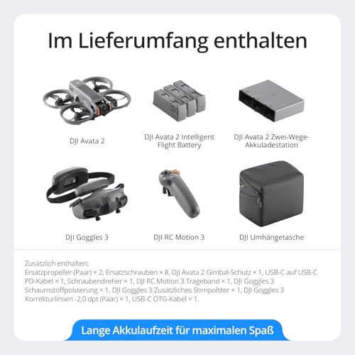 Il DJI Avata 2 Fly More Combo (3 batterie) è il pacchetto definitivo. Include il drone, tre batterie intelligenti che forniscono fino a 69 minuti di autonomia totale, DJI RC Motion 3, DJI Goggles 3 e molto altro. È la scelta perfetta per gli utenti che desiderano catturare momenti straordinari con la massima libertà e creatività .