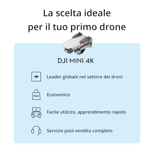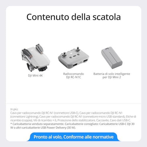 Il set include il DJI Mini 4K, 1 batteria, un radiocomando RC-N1C e tutto il necessario per voli facili e di alta qualità in 4K. È una scelta eccellente e conveniente per i principianti che desiderano entrare nel mondo dei droni senza compromessi.