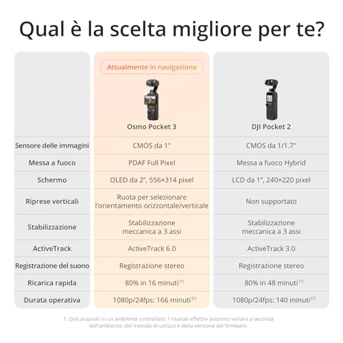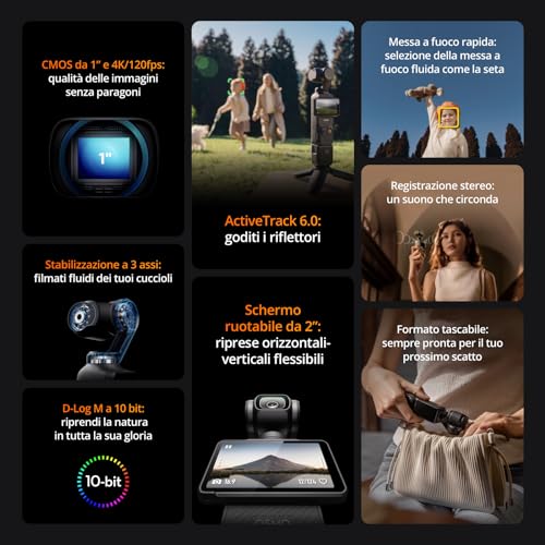La DJI Osmo Pocket 3 è la videocamera tascabile che ridefinisce il concetto di ripresa portatile, offrendo una qualità d’immagine e una stabilizzazione eccezionali in un formato incredibilmente compatto. Con il suo sensore CMOS da 1”, puoi catturare filmati straordinari in 4K a ben 120 fps, immortalando panorami notturni e tramonti mozzafiato con una nitidezza e una gamma dinamica senza precedenti. Ogni dettaglio prenderà vita, anche in condizioni di scarsa illuminazione.